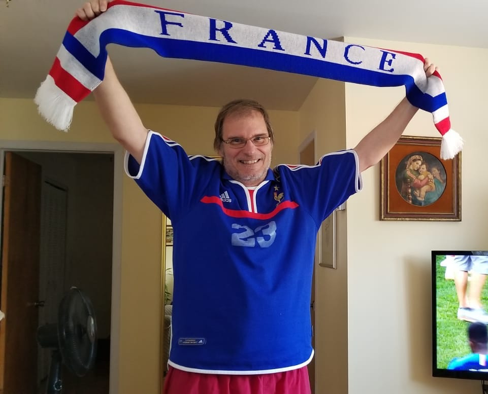 Jocelyn triomphe suite à la victoire des Bleus sur la Croatiie à la finale de la coupe du monde 2018.