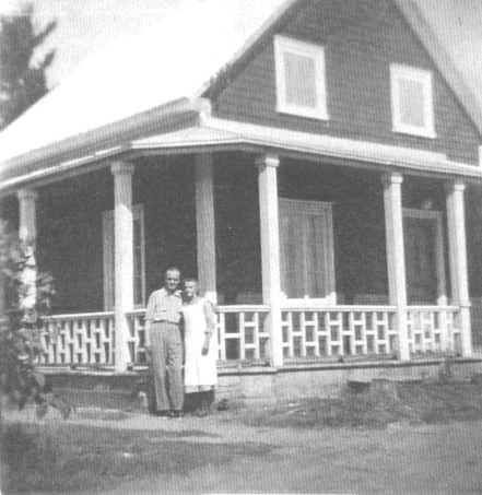 Sophie Benoît et son fils Lucien devant la maison d'Octave Borgia à Chute-Paent en 1950.