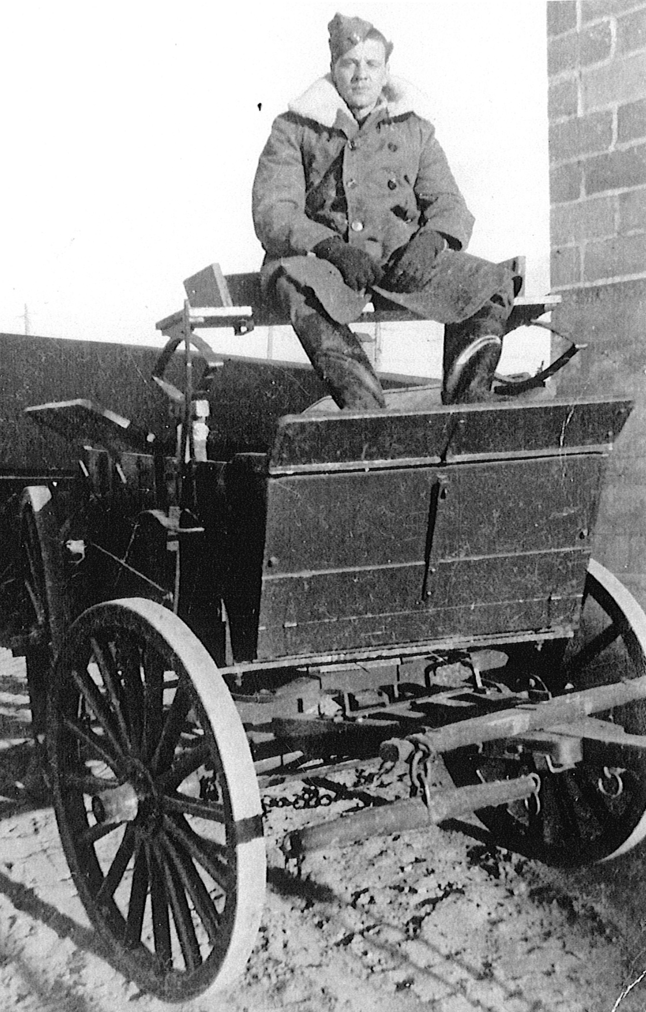 Louis-Philippe photographié en habit de soldat assis sur un banc de cariole