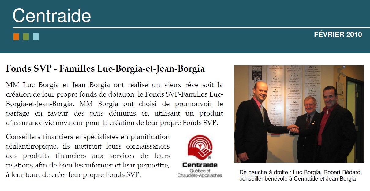 Le Fonds SVP Familles Luc Borgia et Jean Borgia crée en collaboration avec Centraide et la fondation communautaire du grand Québec.