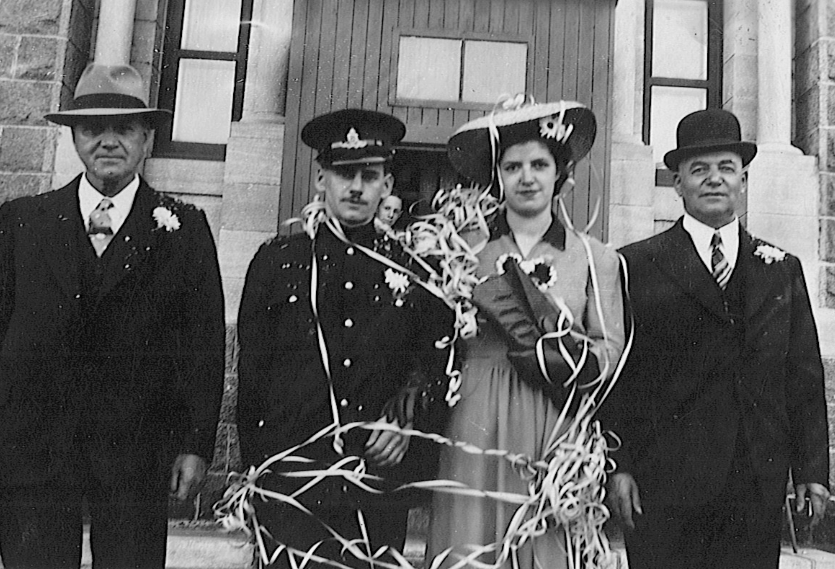Mariage de Marcel Borgia et Pierrette Tremblay. Raymond Borgia à la gauche de Marcel et Médirée Tremblay à la droite de Pierrette.